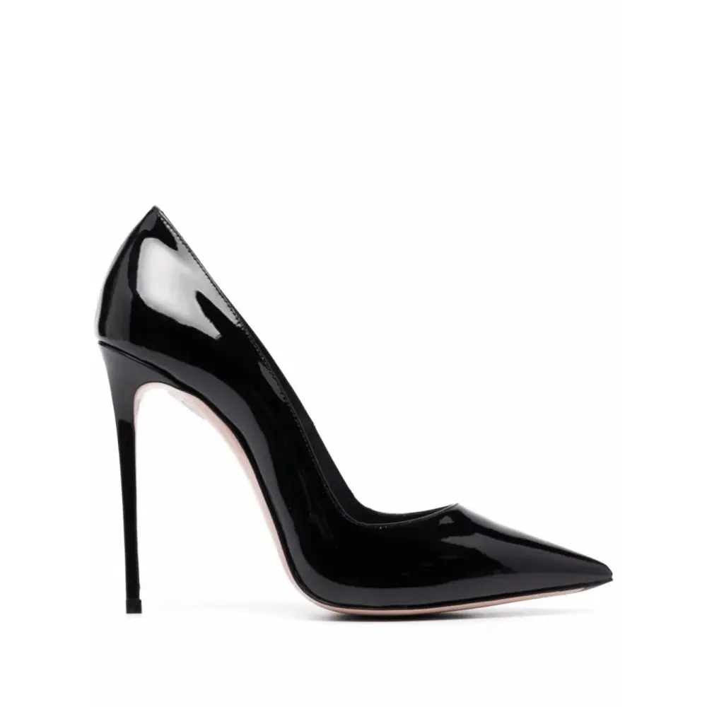 Кожаная подкладка, заостренный носок, модель без застежки, стелька с логотипом и высокий каблук.