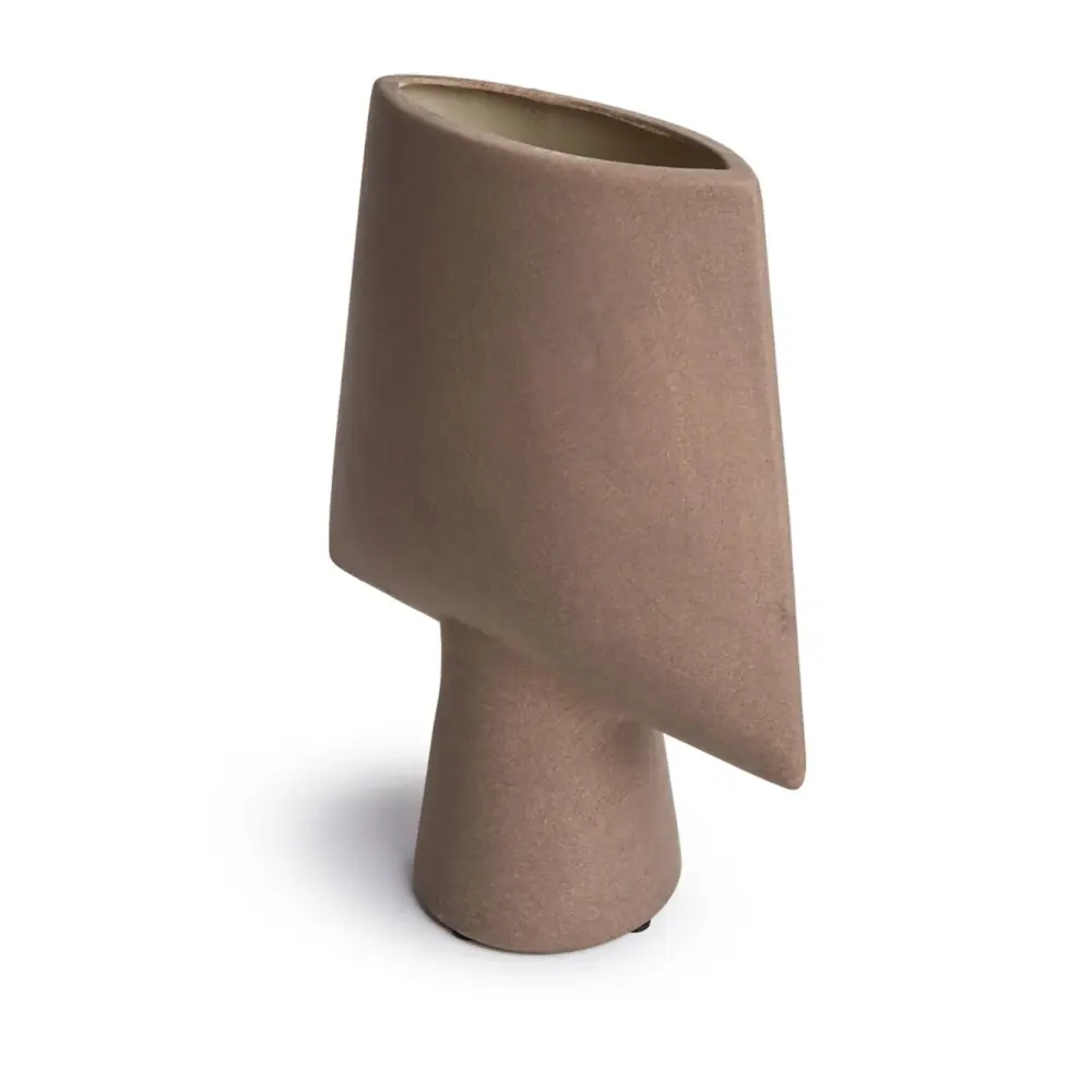 Серо-коричневый, керамика, закругленная форма, дизайн с открытым верхом и естественное покрытие.