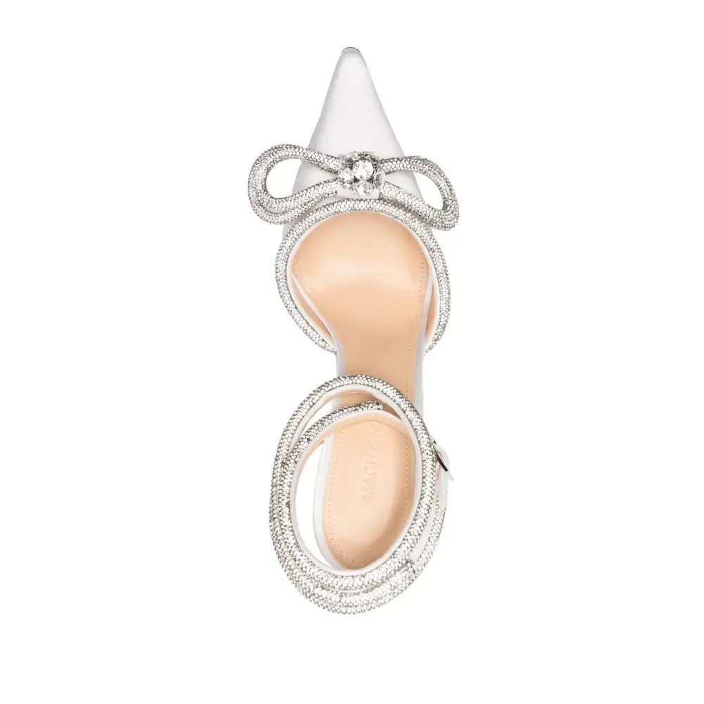 Белый, телячья кожа, шелковый атлас, заостренный носок, бант, декор из кристаллов, ремешок на щиколотке с пряжкой, кожаная стелька с логотипом и каблук на высокой шпильке.