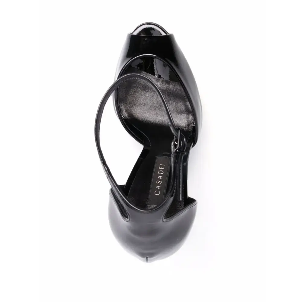 Лакированное покрытие, открытый носок, ремешок на щиколотке с пряжкой, подошва на платформе и каблук на высокой шпильке. Цвет: черный.