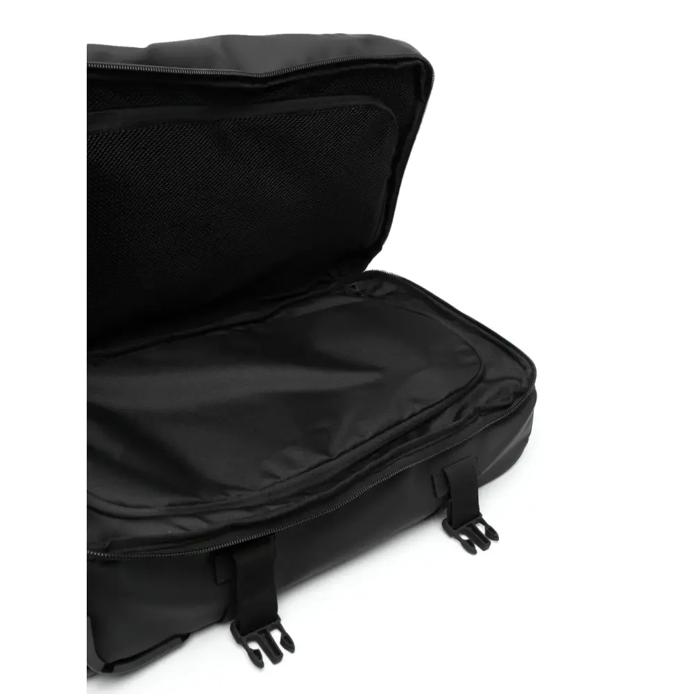 Черный, логотип спереди, эластичные резинки, ручка с плоским верхом, круговая молния, основное отделение, внутренние карманы на молнии, несколько отделений и два колеса. Узнать больше о том, какие товары получают отметку «Ответственный выбор», можно из материала «Как мы оцениваем экологичность и этичность».