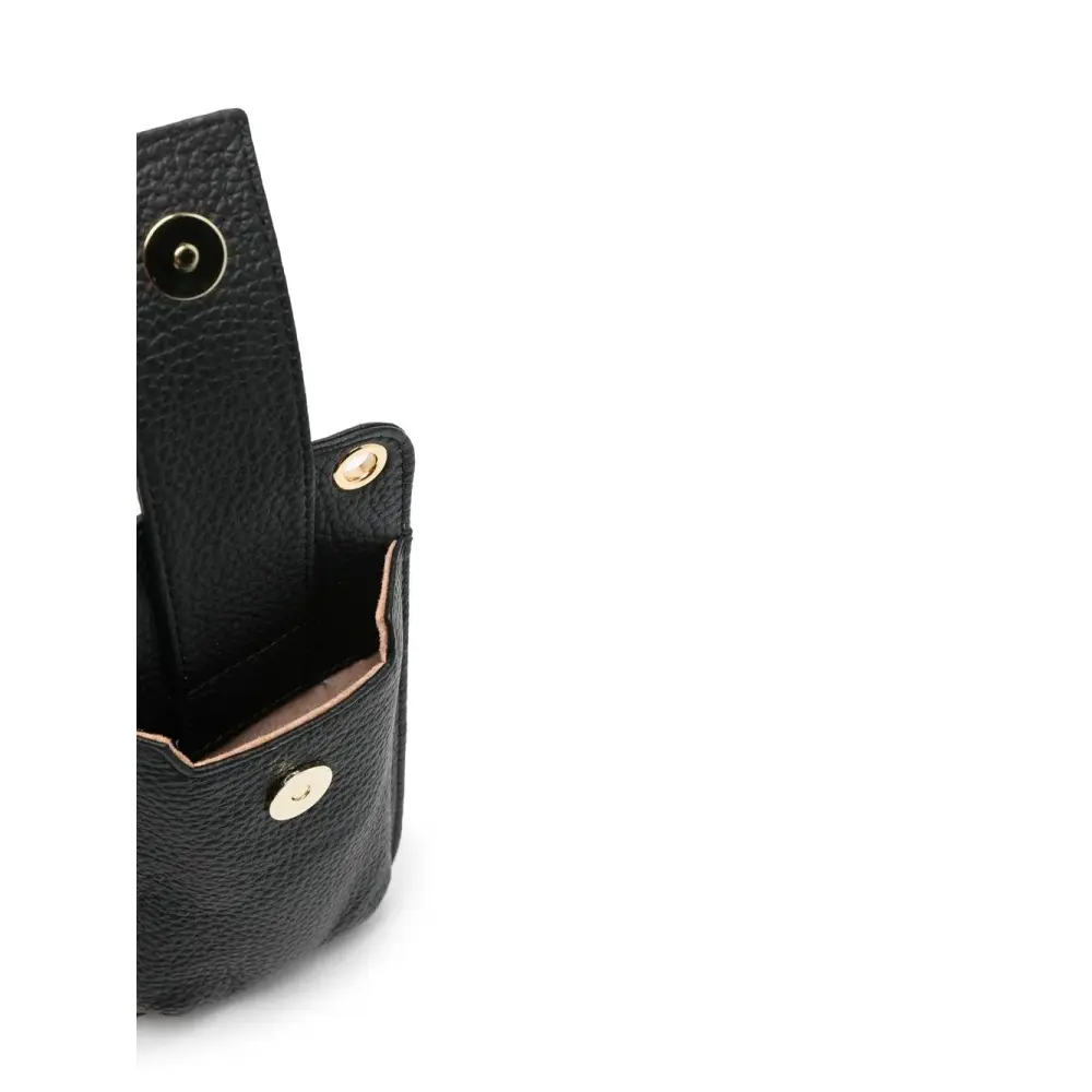 Черный, телячья кожа, зернистая текстура, тисненый логотип спереди, отделка металлическими люверсами, золотистая фурнитура, съемный ремень на плечо, застежка-карабин, застежка на ремешке и магните и основное отделение.