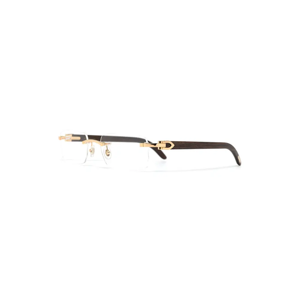 Квадратная оправа, линзы без оправы, золотистая фурнитура и носоупоры. Прилагается защитный чехол.