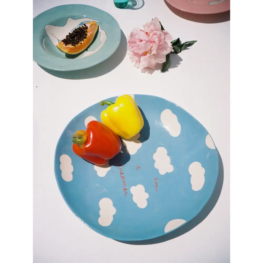 Голубой, разноцветный, сплошной графичный принт, принт с надписью спереди и круглая оправа.