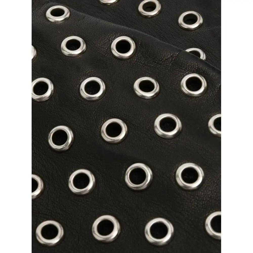 Черный, кожа, серебристая фурнитура, отделка металлическими люверсами, кольцо на всю фалангу и модель без застежки.