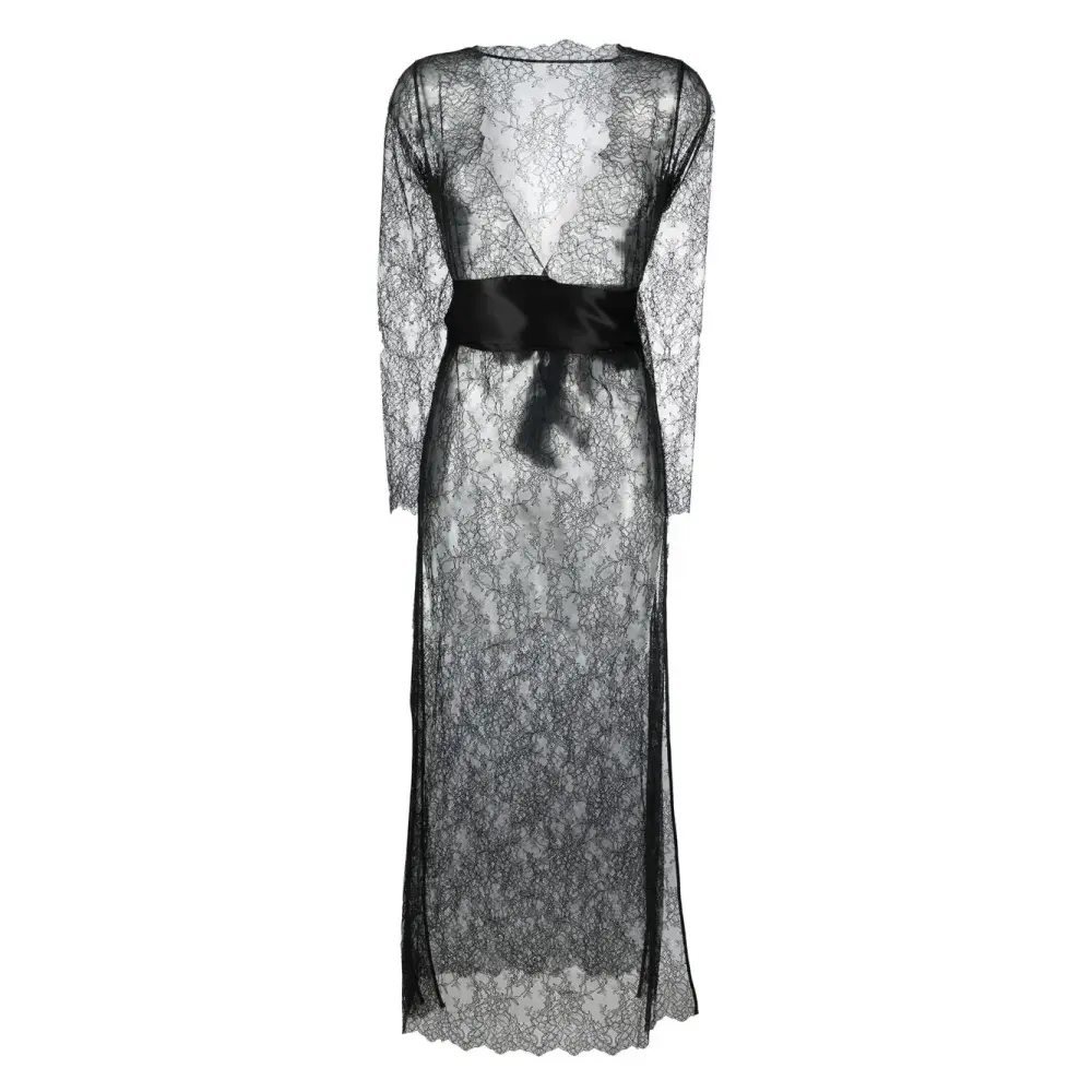 Черный, шелк, прозрачное покрытие, вставки из цветочного кружева, ремень на талии, края с фестонами, V-образный вырез, длинные рукава и длинная модель.
