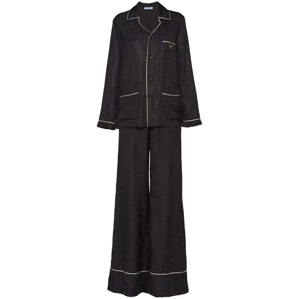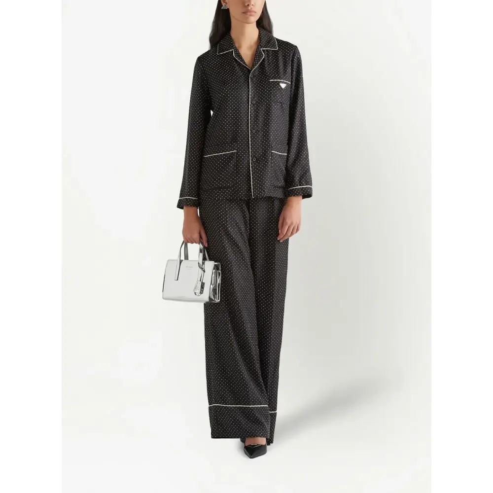 Черный, шелк, принт в горох, контрастная отделка, отложный воротник, застежка на пуговицах спереди, длинные рукава, нагрудный накладной карман, треугольный эмалированный логотип, два накладных кармана спереди, эластичный пояс и широкий крой.