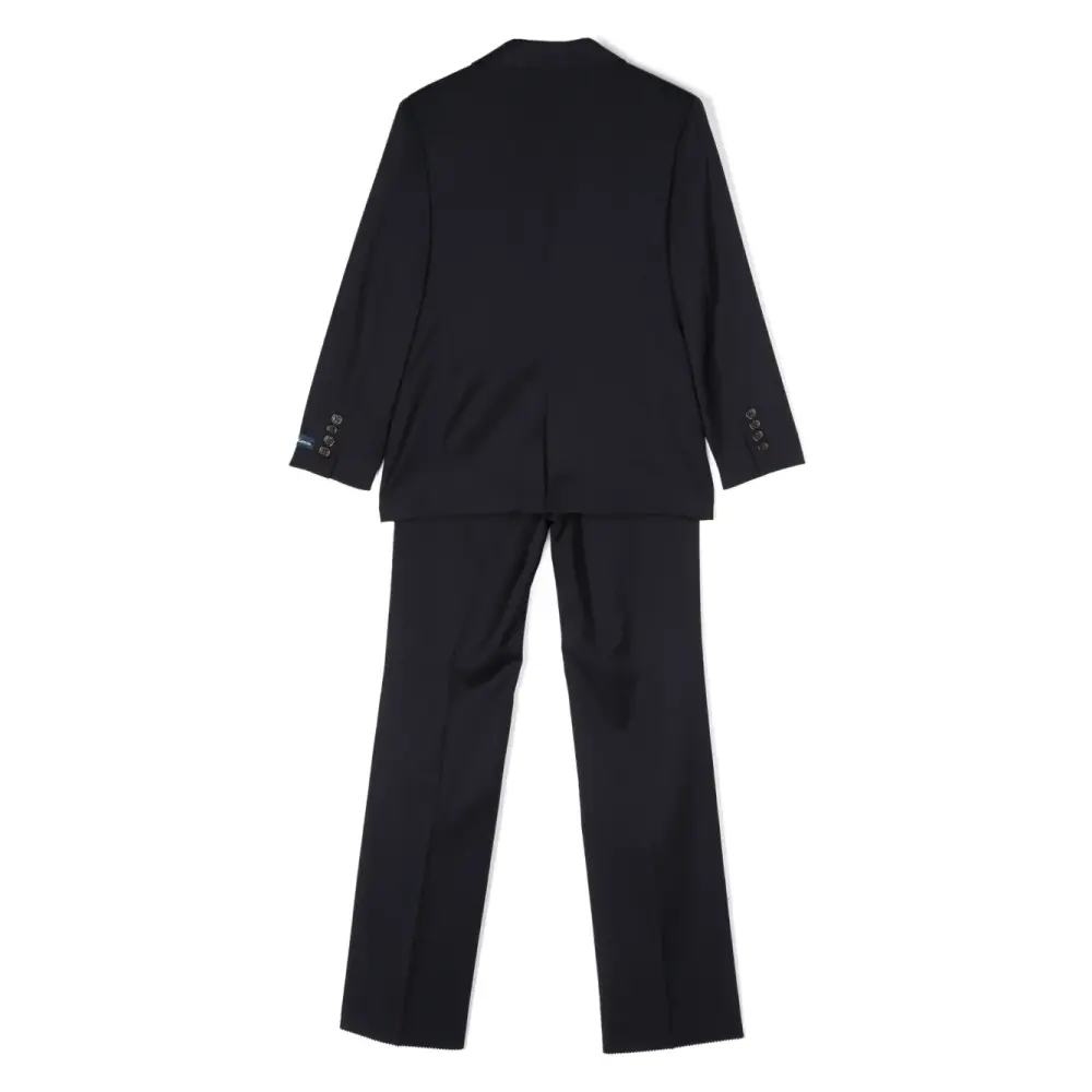 Темно-синий, шерсть, зазубренные лацканы, застежка на пуговицах спереди, два передних кармана с клапанами, прорезной карман на груди, длинные рукава, рукава с манжетами на пуговицах, нашивка с логотипом на рукаве, прямой подол, шлица по центру сзади, петли для ремня, стрелки, потайная застежка на молнии и пуговицах, прямой крой, два прорезных кармана по бокам и прорезной карман на пуговице сзади.