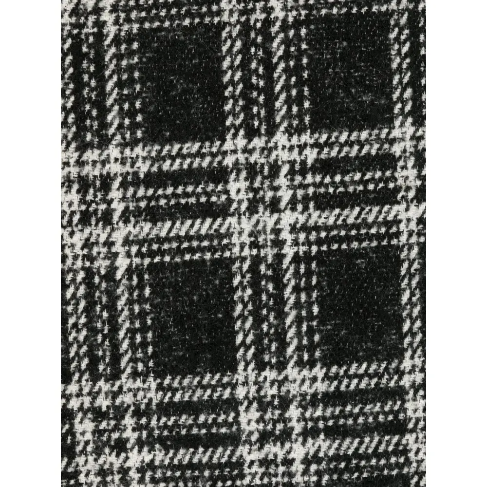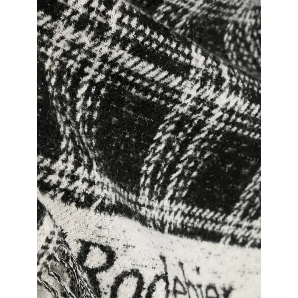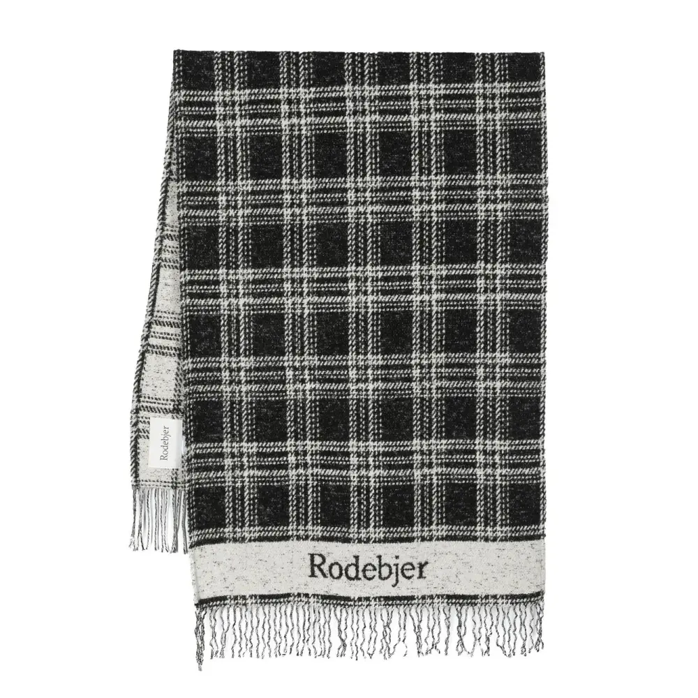 Черный/белый, жаккардовый логотип, клетчатый узор, края с бахромой и маленькая подвеска с логотипом.