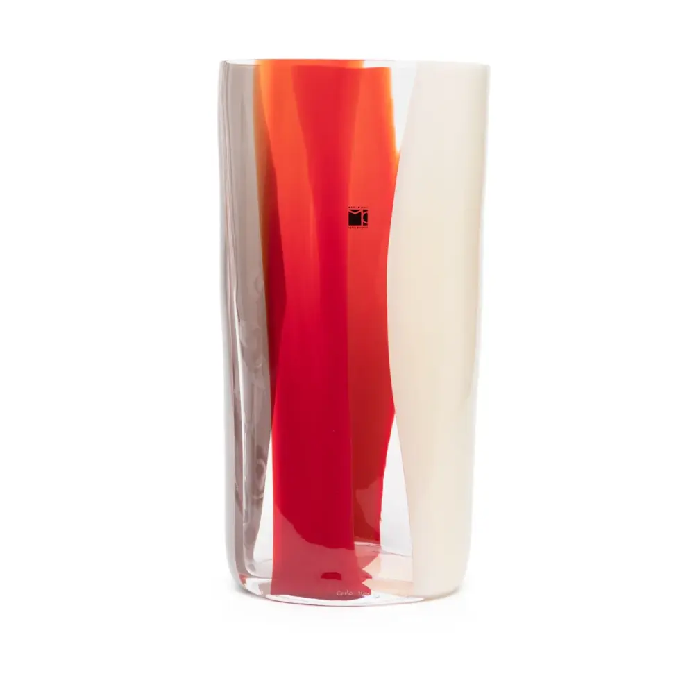 Светло-бежевый, красный, серый, стекло, узор в полоску, логотип сбоку и дизайн с открытым верхом.