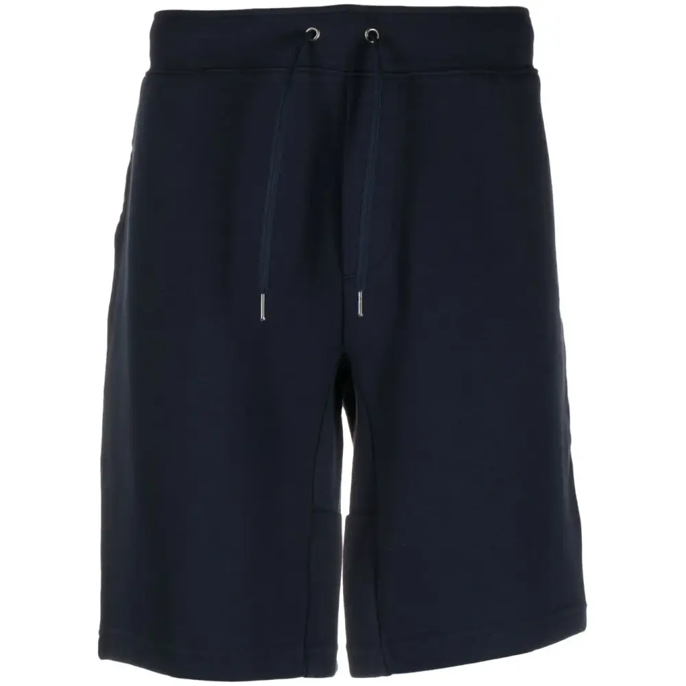 Темно-синий, смесовый хлопок, кулиска на талии, два прорезных кармана по бокам, вышитый логотип сбоку, накладной карман сзади и длина по колено.