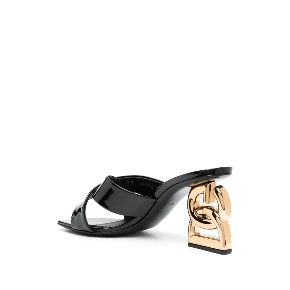 Черный, телячья кожа, золотистый логотип, открытый носок, перекрестные ремешки, стелька с логотипом и каблук средней высоты.