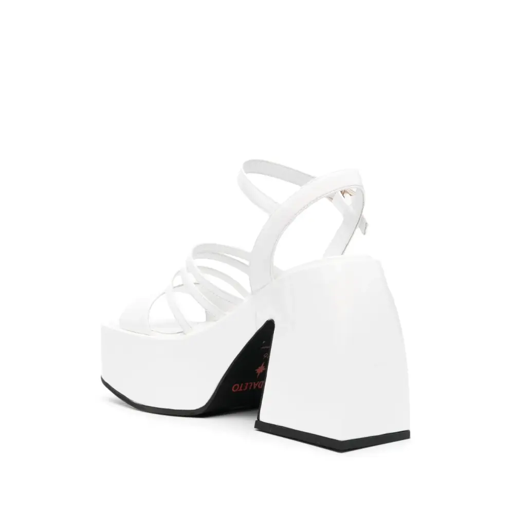 Белый, телячья кожа, лакированная отделка, открытый носок, ремешки, ремешок на щиколотке с пряжкой, подошва на платформе, золотистая фурнитура и контрастная резиновая подошва.
