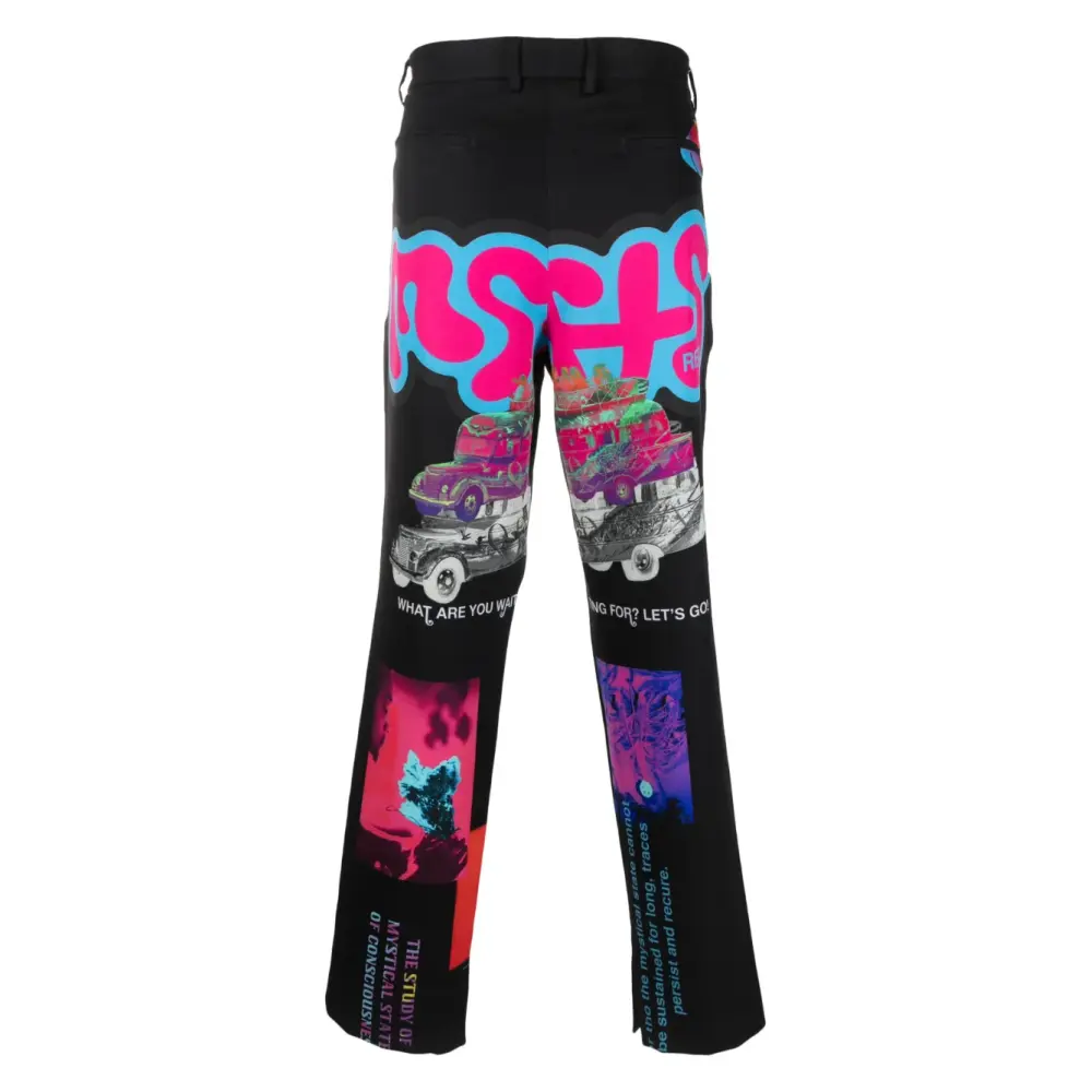 Черный/разноцветный, эластичный хлопок, сплошной графичный принт, принт с логотипом сзади, петли для ремня, ширинка на пуговицах, средняя посадка, прямой крой и прямой подол.