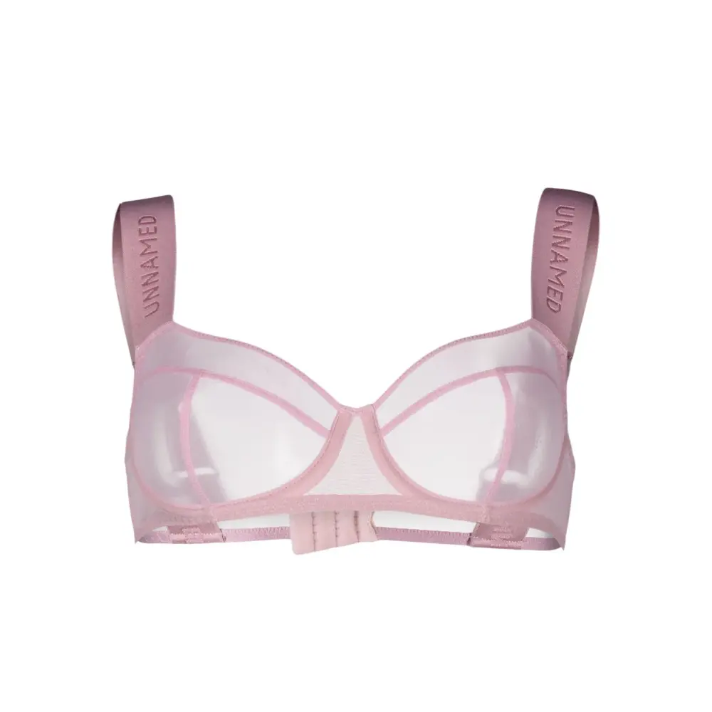 Розовый, сетчатый тюль, полупрозрачный дизайн, балконет, чашка на косточках, ремешки с логотипом, регулируемые лямки и застежка на крючок сзади. Эту вещь можно примерить, но только поверх собственного белья.