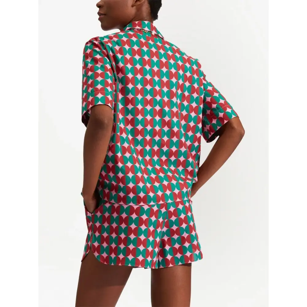Разноцветный, хлопок, геометричный принт, короткие рукава, застежка на пуговицах спереди, два передних кармана, контрастная строчка и эластичный пояс.