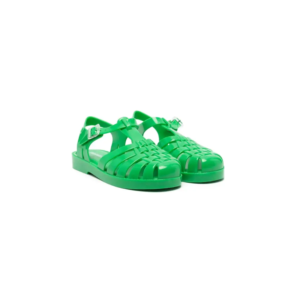 Ярко-зеленый, конструкция с внешним каркасом, закругленный носок, застежка на пряжке, стелька с логотипом и плоская резиновая подошва.