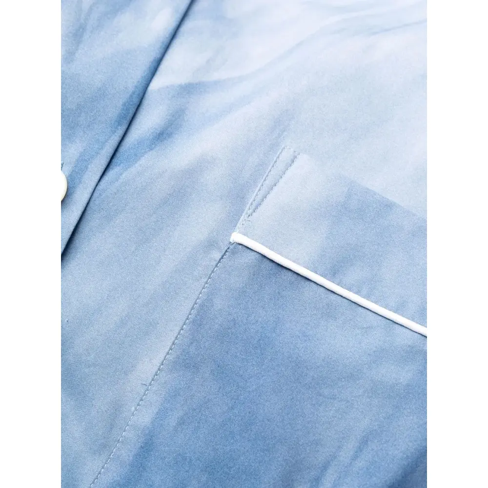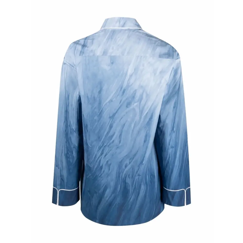 Объемная окантовка, градиентный эффект, классический воротник, застежка на пуговицах спереди, длинные рукава и нагрудный накладной карман.