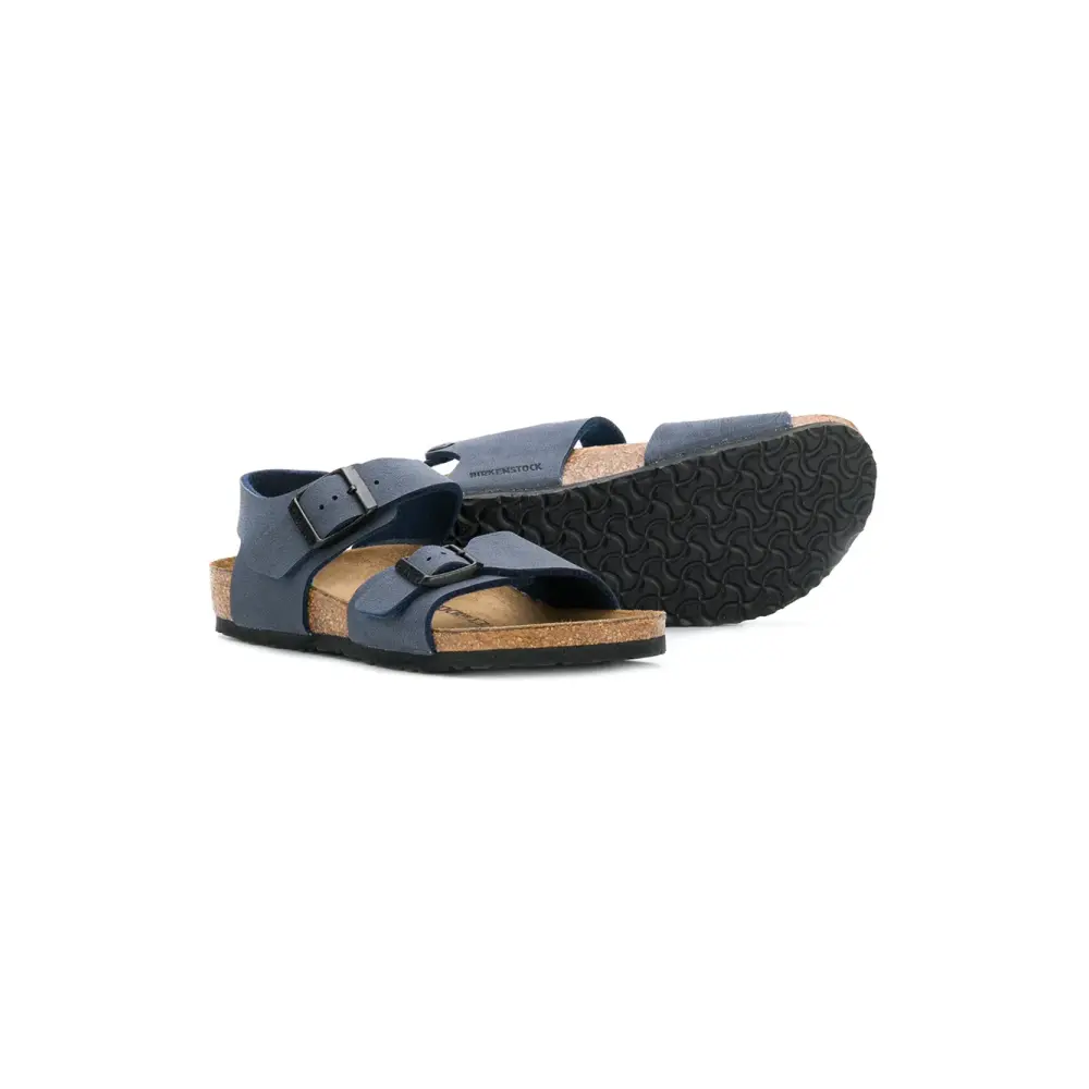 Темно-синие сандалии с пряжками от BIRKENSTOCK Kids. Открытый носок, фирменная стелька, плоская подошва.