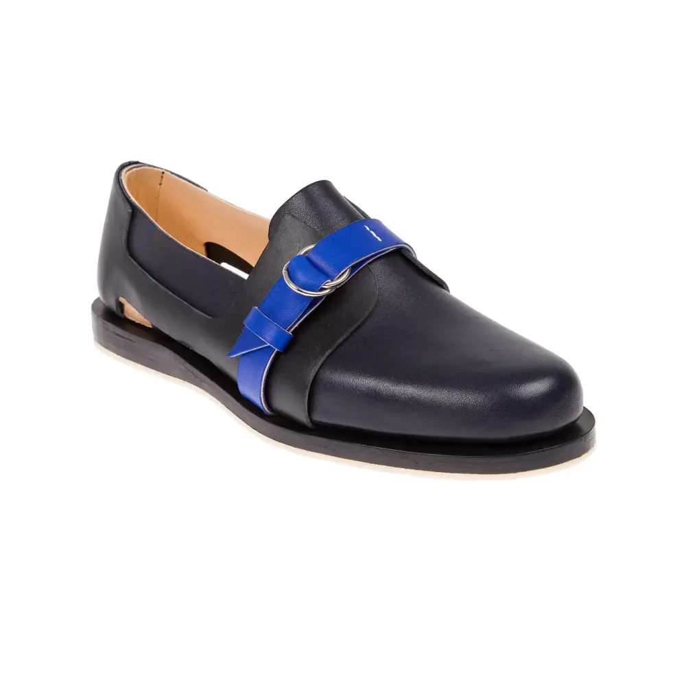 Черные с синим кожаные туфли-монки с контрастным ремешком от Ets Callatay. Закруглённый носок, резиновая подошва, ремешок на щиколотке и пряжка сбоку.