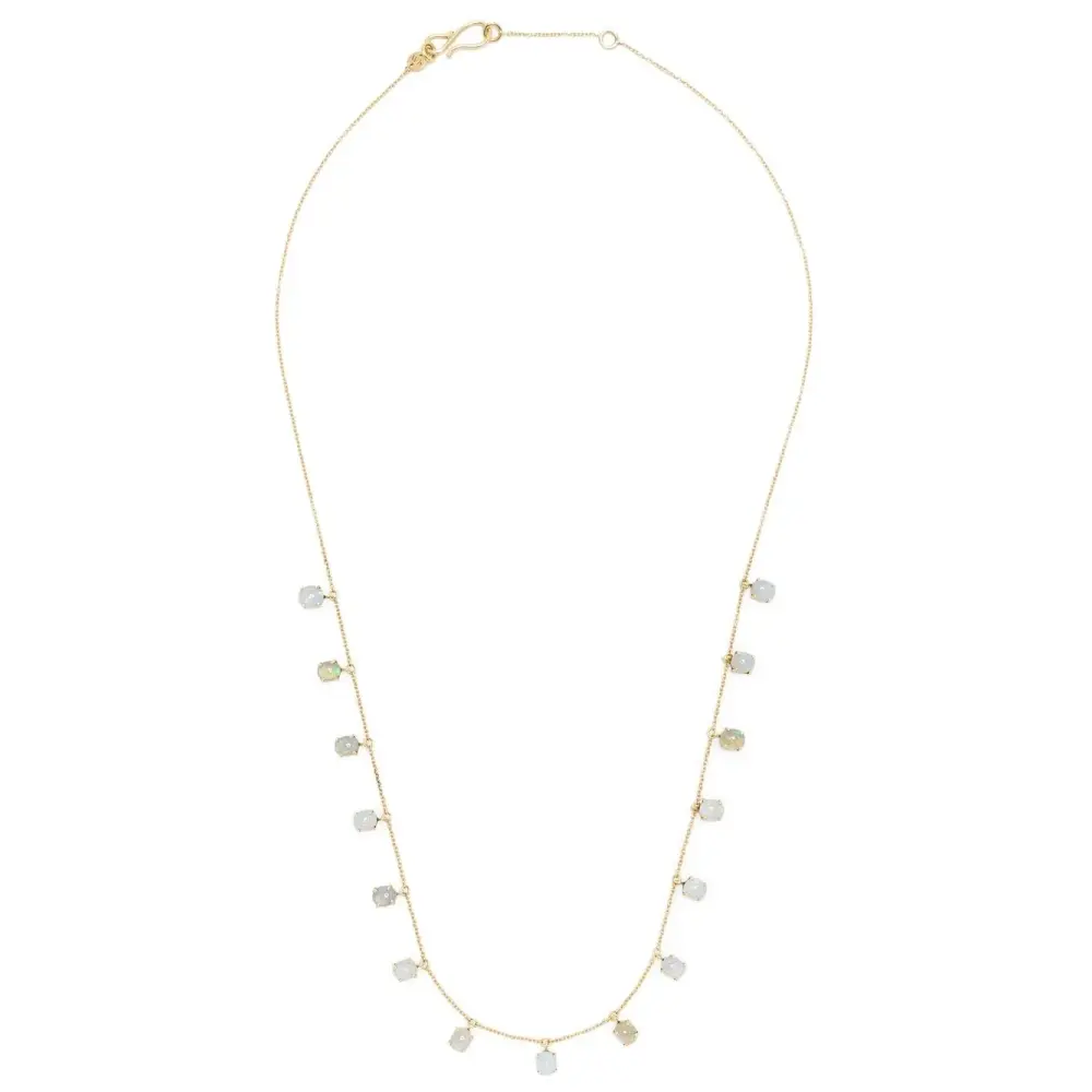 Застежка на крючок, тонкая цепочка и глянцевая фактура.