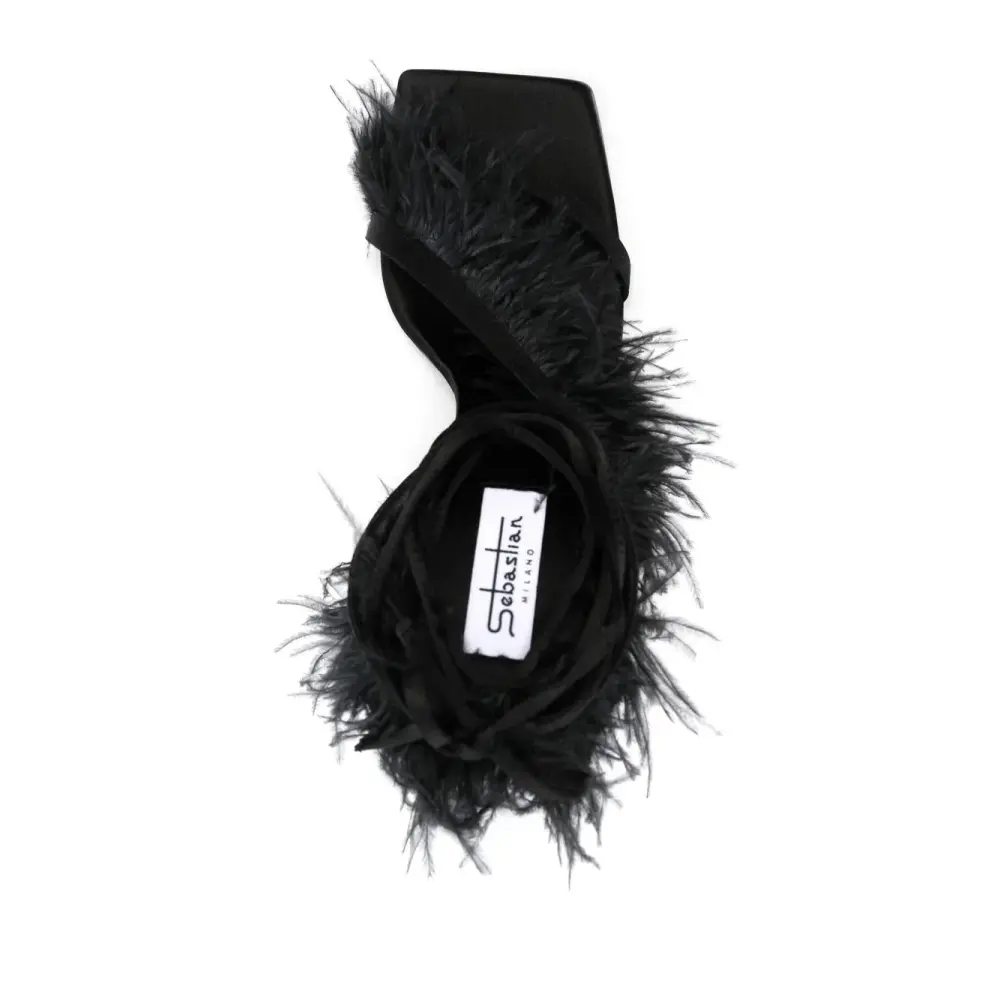 Черный, телячья кожа, отделка перьями, завязка на щиколотке, открытый носок, квадратный носок и высокий скульптурный каблук.