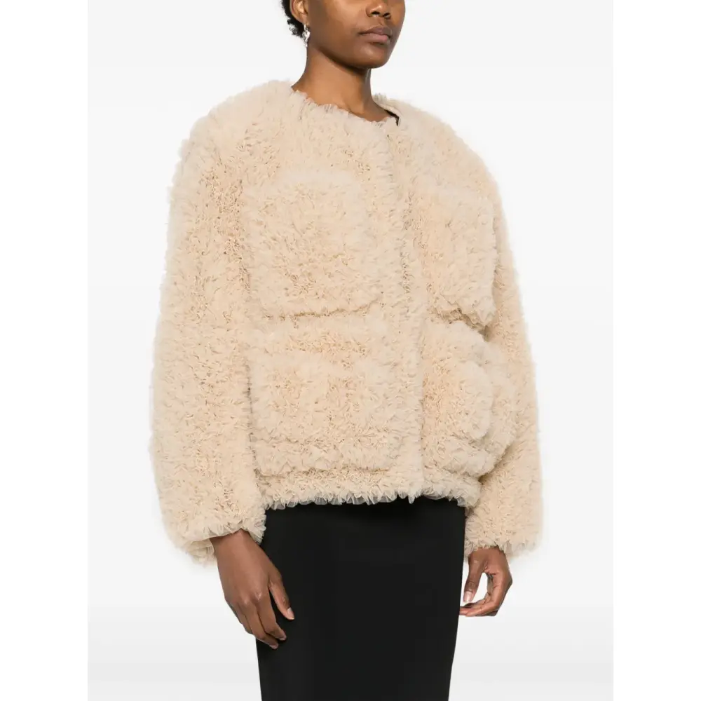 Песочно-бежевый, вставки из тюля, модель с оборками, фактурная отделка, круглый вырез, потайная застежка спереди, длинные рукава, четыре накладных кармана спереди и прямой подол.