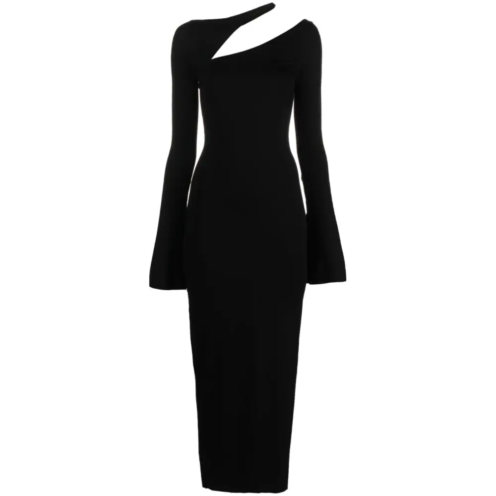 Черный, эластичный материал, вырез-лодочка, вырезные детали, длинные рукава, расклешенные манжеты, боковой разрез и длинная модель.