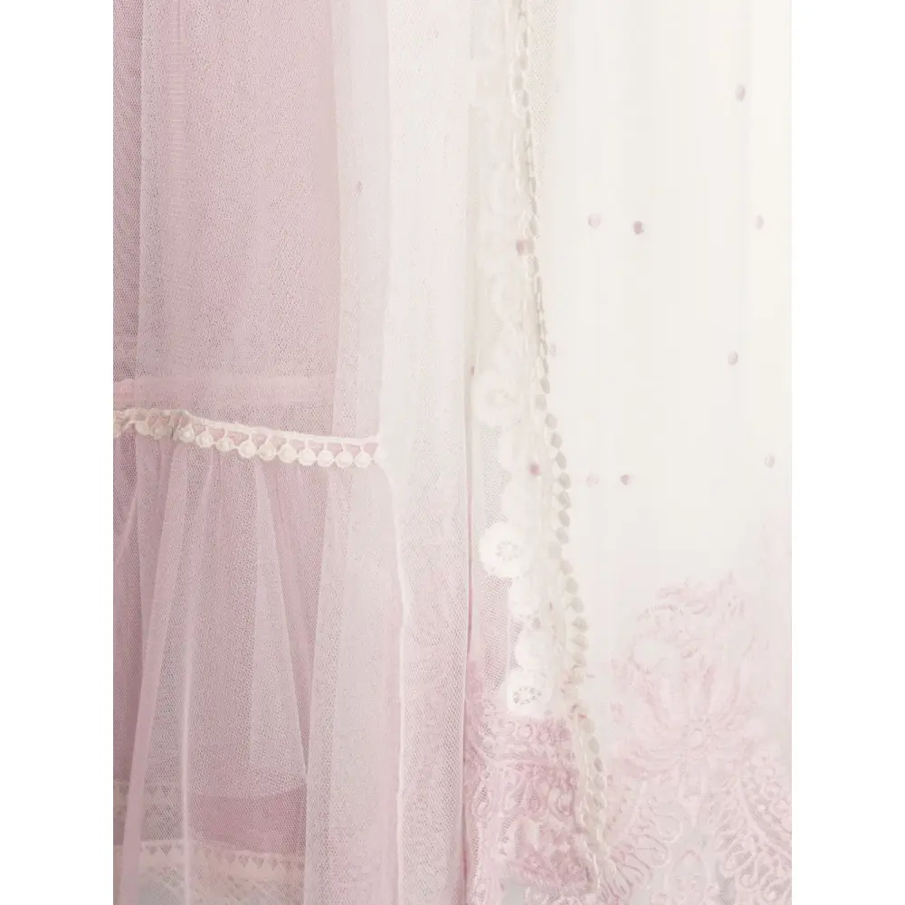 Кремово-белый, светло-розовый, сетчатый тюль, ампирный силуэт, многослойная деталь, вставки из кружева, тюль пуэн-деспри, кружевная отделка, ярусная юбка, края с фестонами, круглый вырез, квадратный вырез на спине, застежка на пуговицы сзади, застежка на крючок сзади, длинные прозрачные рукава, расклешенные манжеты, застежка на завязке сзади и длина макси.