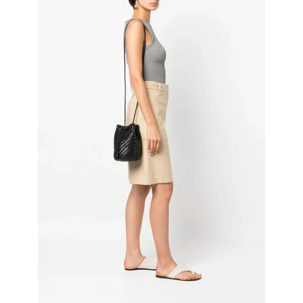 Черный, кожа, переплетенный дизайн, декоративные кисточки, модель ведро и кулиска.