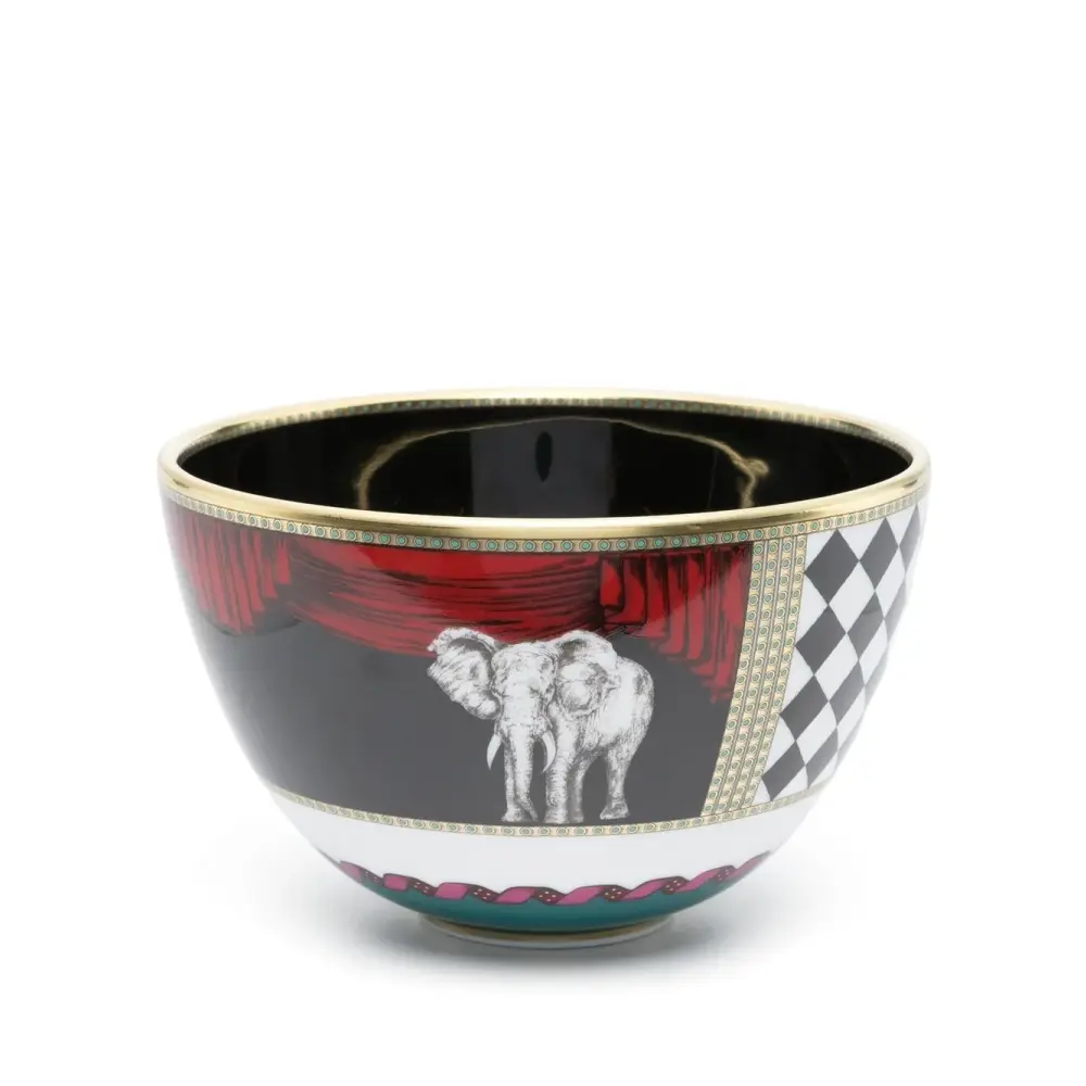 Черный/разноцветный, фарфор, принт с изображением слонов, геометричный узор и золотистая отделка.