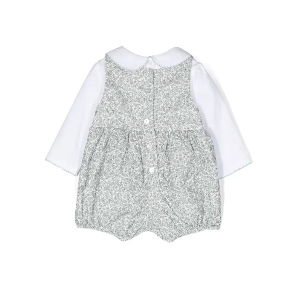 Расцветка Cloud White, зеленый, хлопок, контрастные вставки, цветочный принт, вышитые края, бант, воротник Питер Пэн, застежка на пуговицы сзади, длинные рукава и эластичные манжеты.
