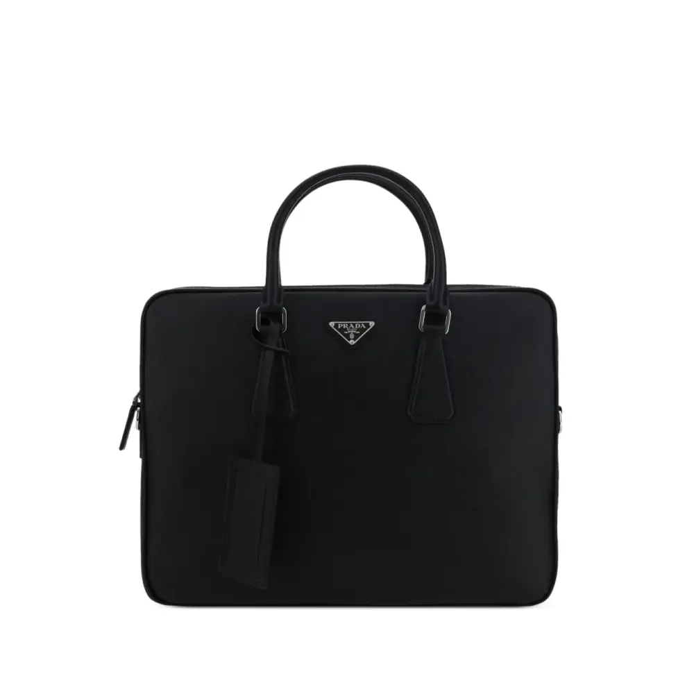 Сафьяновая кожа, треугольный эмалированный логотип, серебристая фурнитура, застежка на молнии сверху, две верхние ручки, съемный регулируемый ремень на плечо и основное отделение. Цвет: черный.