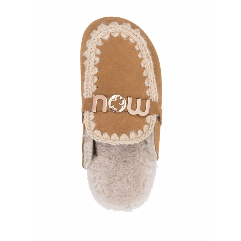Подкладка из овечьей шерсти, металлический логотип, закругленный носок, стелька с логотипом и плоская резиновая подошва.