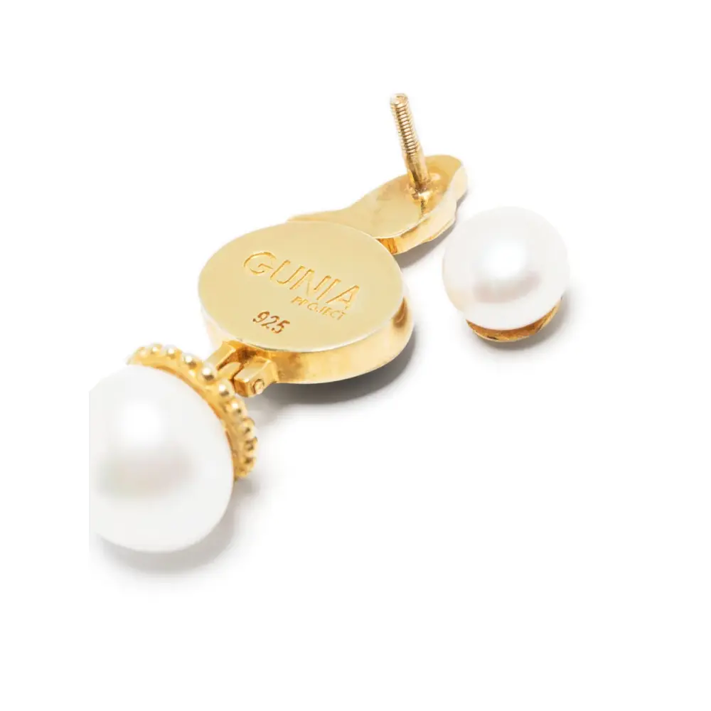 Тисненая деталь, барочный жемчуг и застежка-штифт. В комплект входят две серьги.