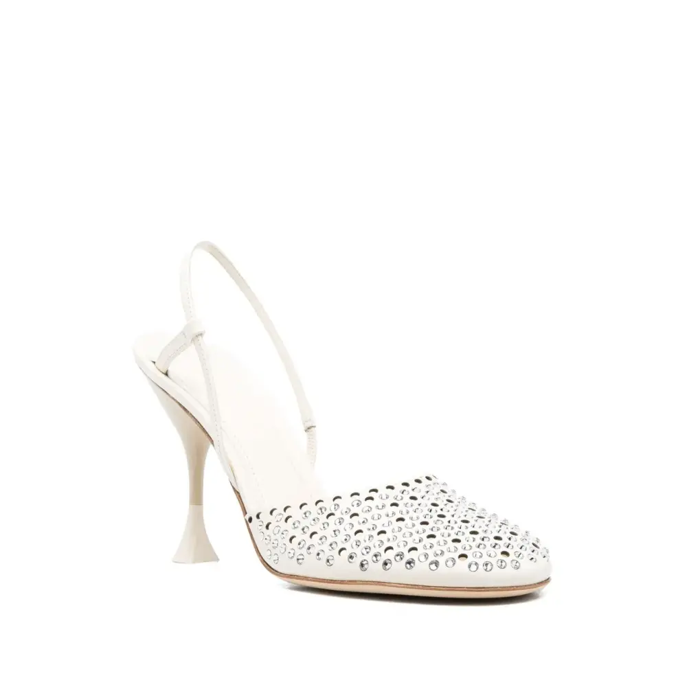 Цвет слоновой кости, телячья кожа, кожаная стелька с логотипом, украшения из горного хрусталя, закругленный носок, ремешок на пятке и высокий скульптурный каблук.