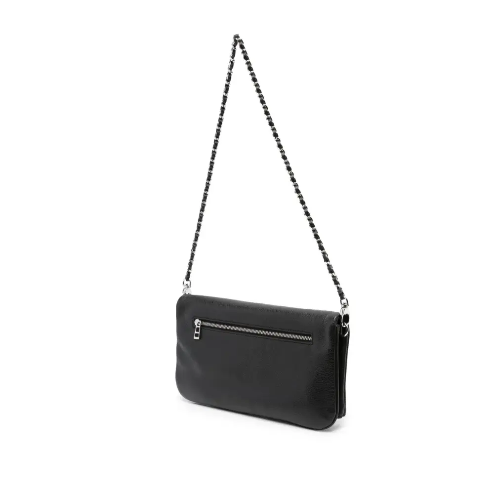 Черный, телячья кожа, серебристая фурнитура, металлический логотип, карман на молнии сзади, откидной клапан на магните, застежка на молнии сверху, внутренний прорезной карман и ремень на плечо с цепочной деталью.