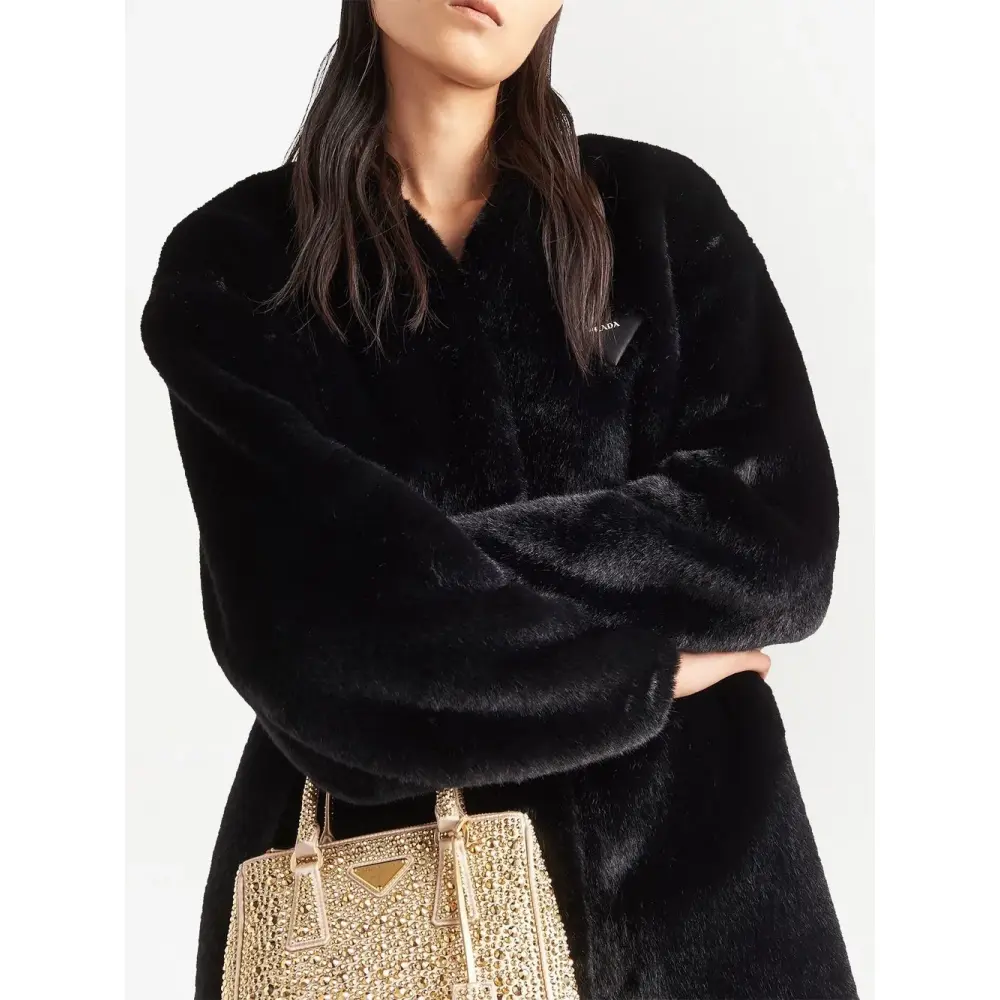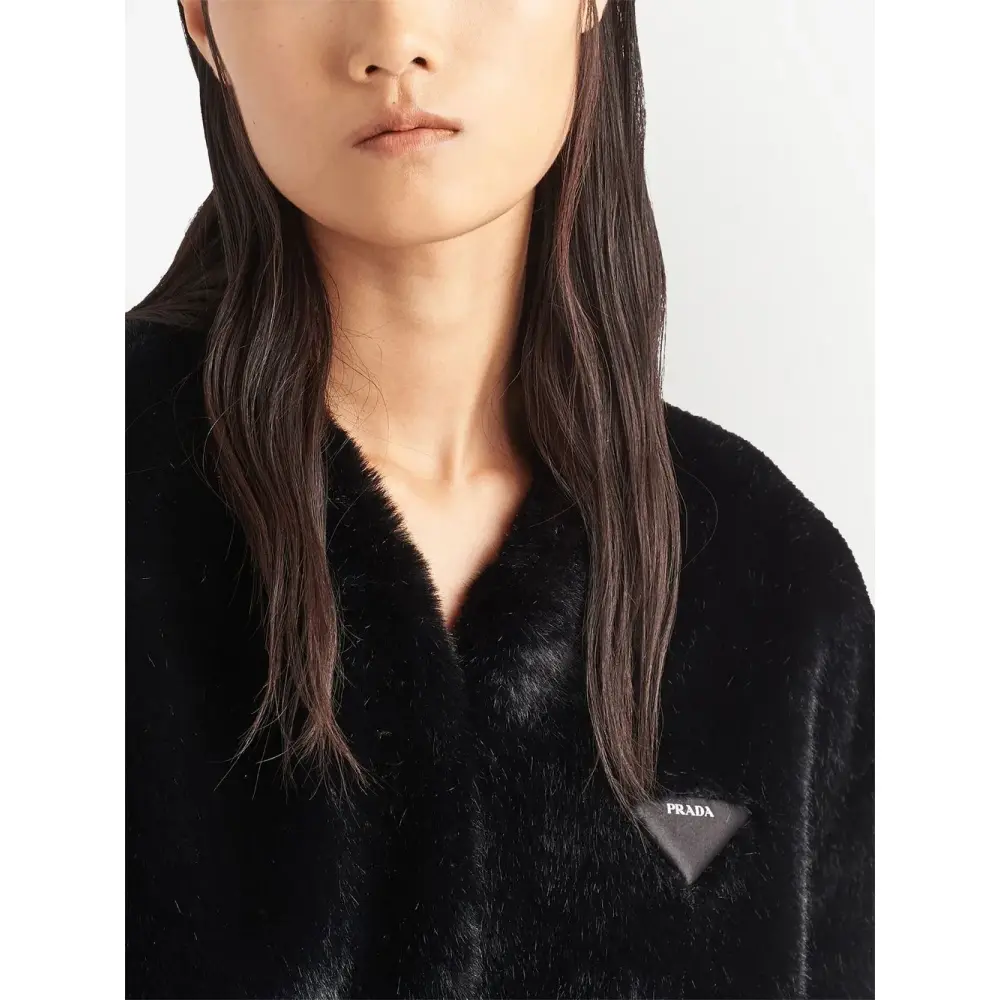 Черный, искусственный мех, треугольный логотип, круглый вырез, застежка на крючке спереди, длинные рукава, прямой подол и длина выше колена.