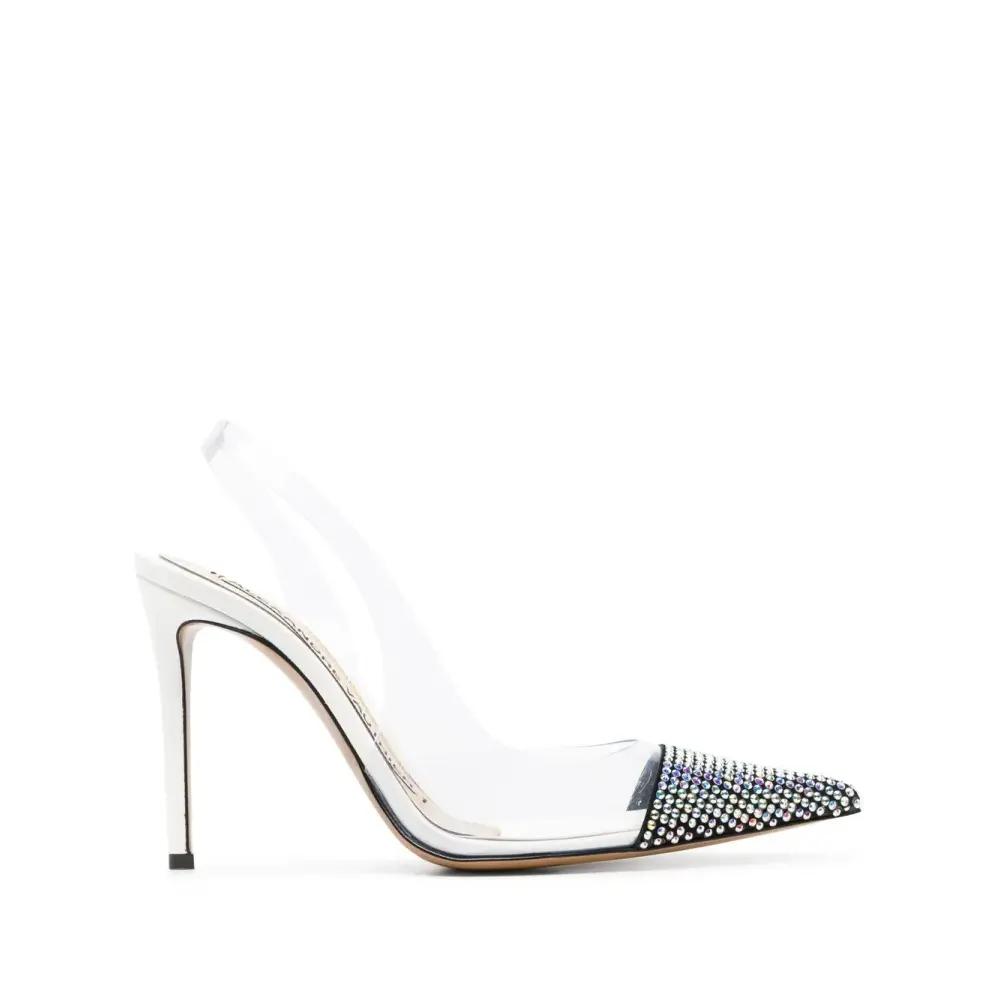 Белый/черный, телячья кожа, прозрачный материал, декор из кристаллов, заостренный носок, кожаная стелька с логотипом, каблук на высокой шпильке и модель без застежки.