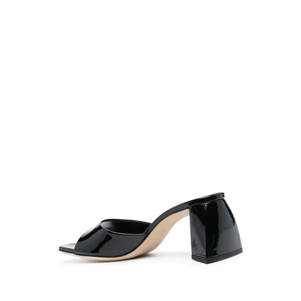 Черный, телячья кожа, стелька с логотипом, открытый носок, ремешок на палец и блочный каблук средней высоты.