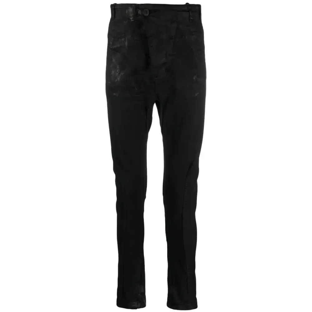 Черный, эластичный хлопок, эффект потертости, низкий шаговый шов, средняя посадка, облегающий крой, петли для ремня, смещенная застежка спереди, два вшитых кармана по бокам и два кармана с листочкой сзади.