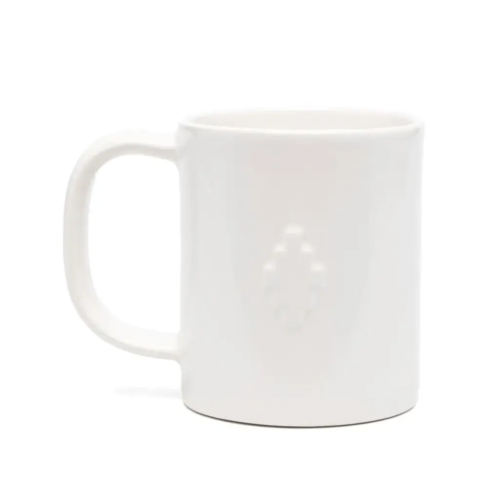 Цвет слоновой кости, фарфор, матовое покрытие, геометричный принт и круглая ручка.
