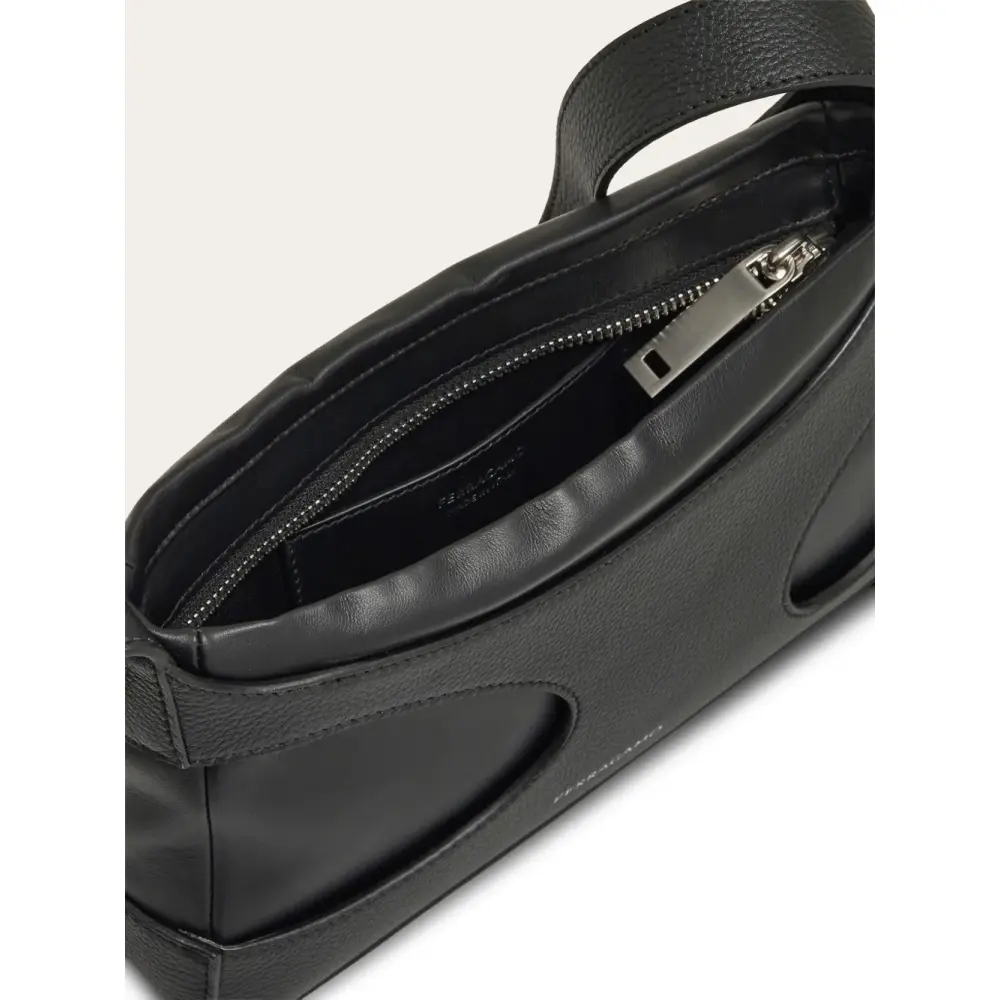 Черный, кожа, овечья кожа, вырезные детали, логотип спереди, верхняя ручка, застежка на молнии сверху и основное отделение.
