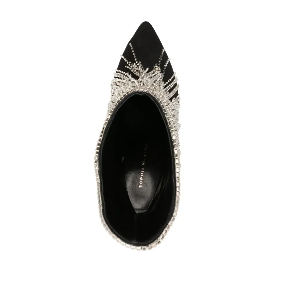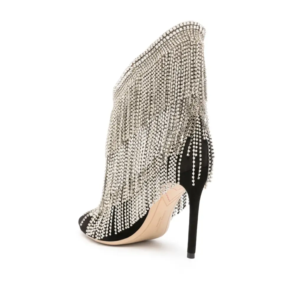 Черный, телячья кожа, пуговицы с кристаллами, бахрома, заостренный носок, модель без застежки, кожаная стелька с логотипом, каблук на высокой шпильке и кожаная подошва.