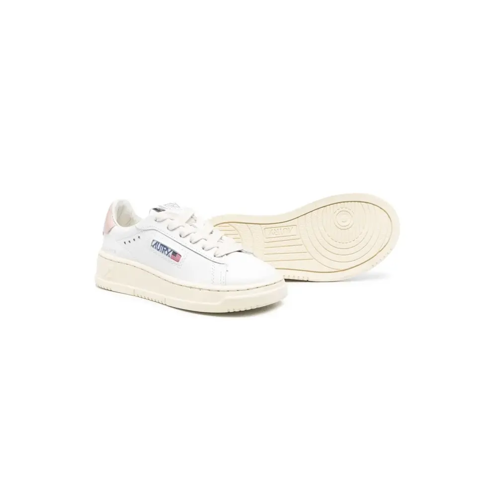 Белый, розовый, телячья кожа, нашивка с логотипом сбоку, перфорация, шнуровка спереди, контрастный задник, закругленный носок, стелька с логотипом и плоская резиновая подошва.