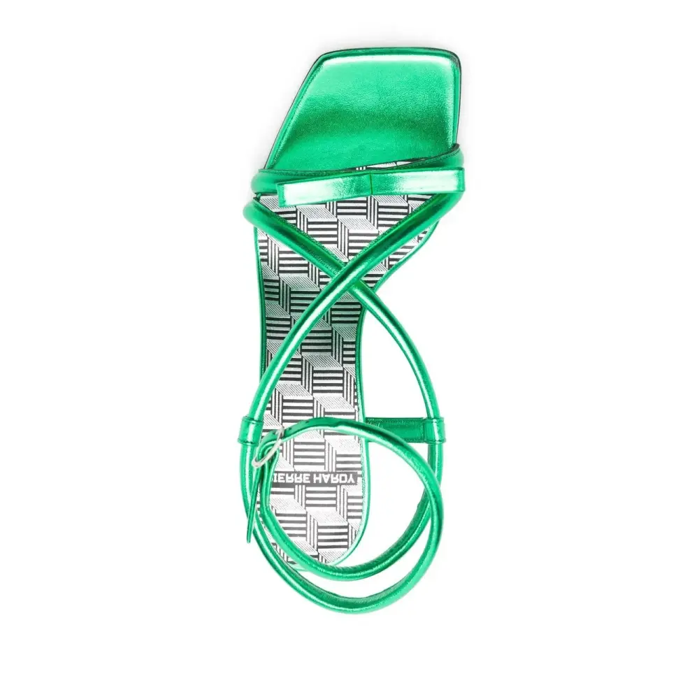Изумрудно-зеленый, телячья кожа, перекрестные ремешки, квадратный носок и ремешок на щиколотке с пряжкой.