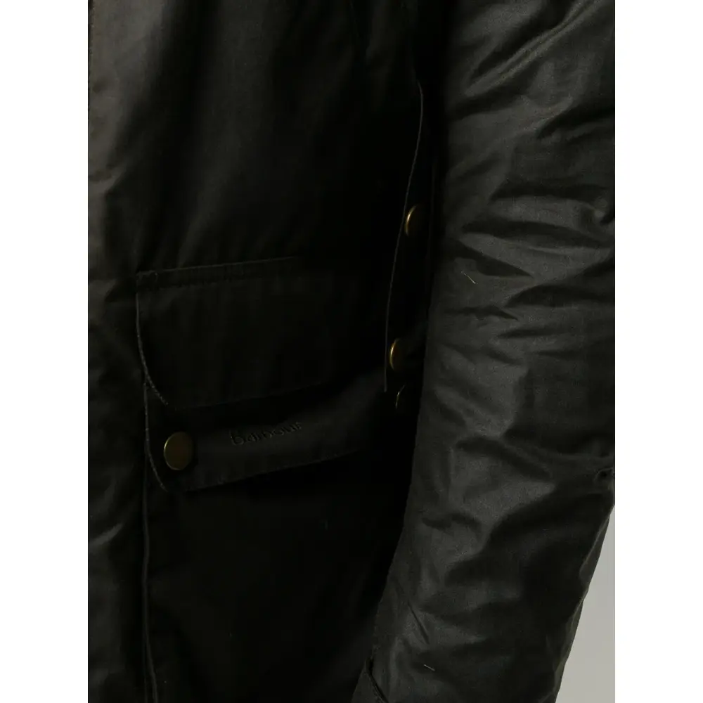 Вощеная ткань, подкладка из искусственной овчины, затягивающийся на шнурок капюшон, передние карманы с клапаном, два кармана по бокам, золотистые пуговицы с тиснением, длинные рукава и застежка на молнии и пуговице спереди.