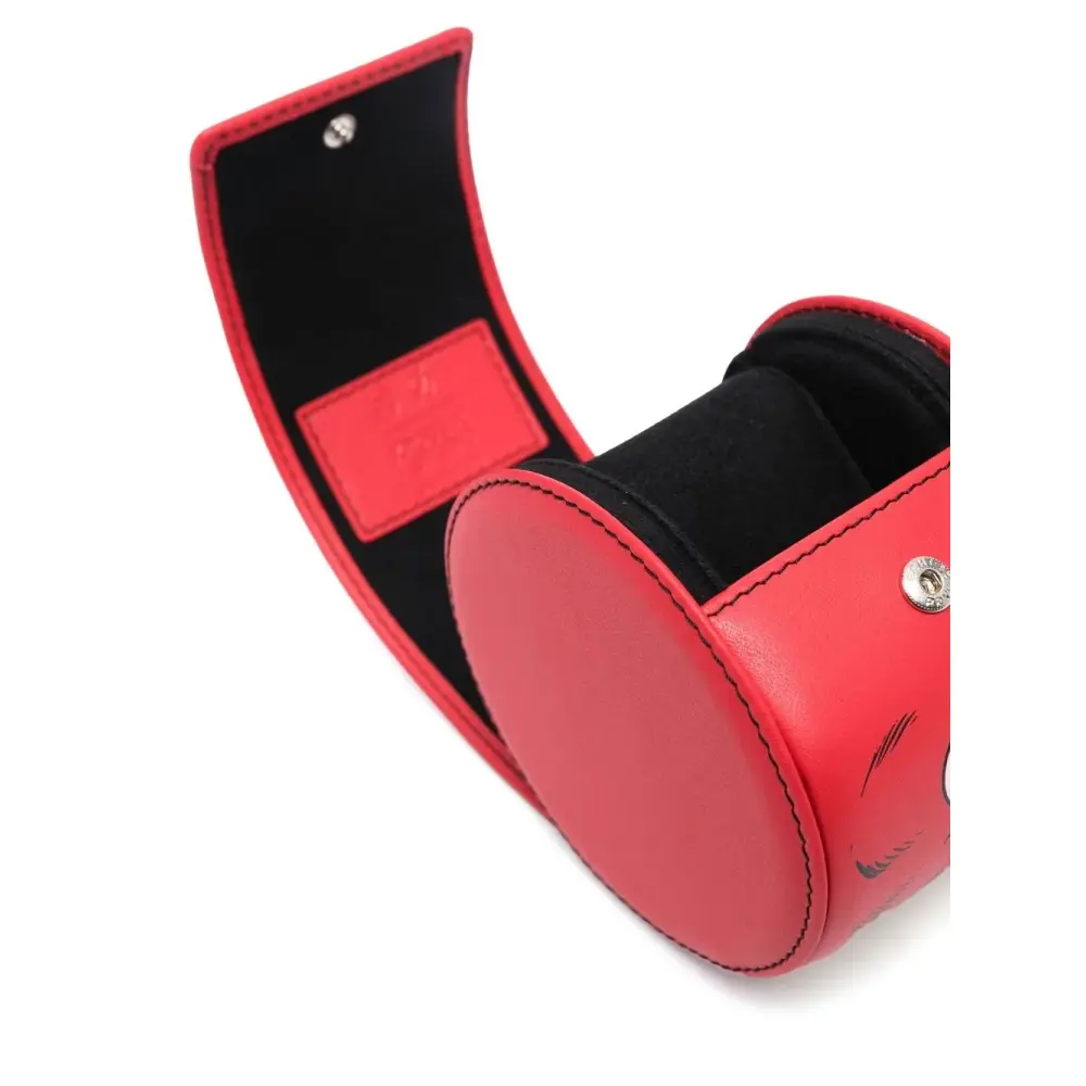 Ярко-красный, кактусовая кожа, сплошной графичный принт, возможность хранения одних часов и откидной клапан.