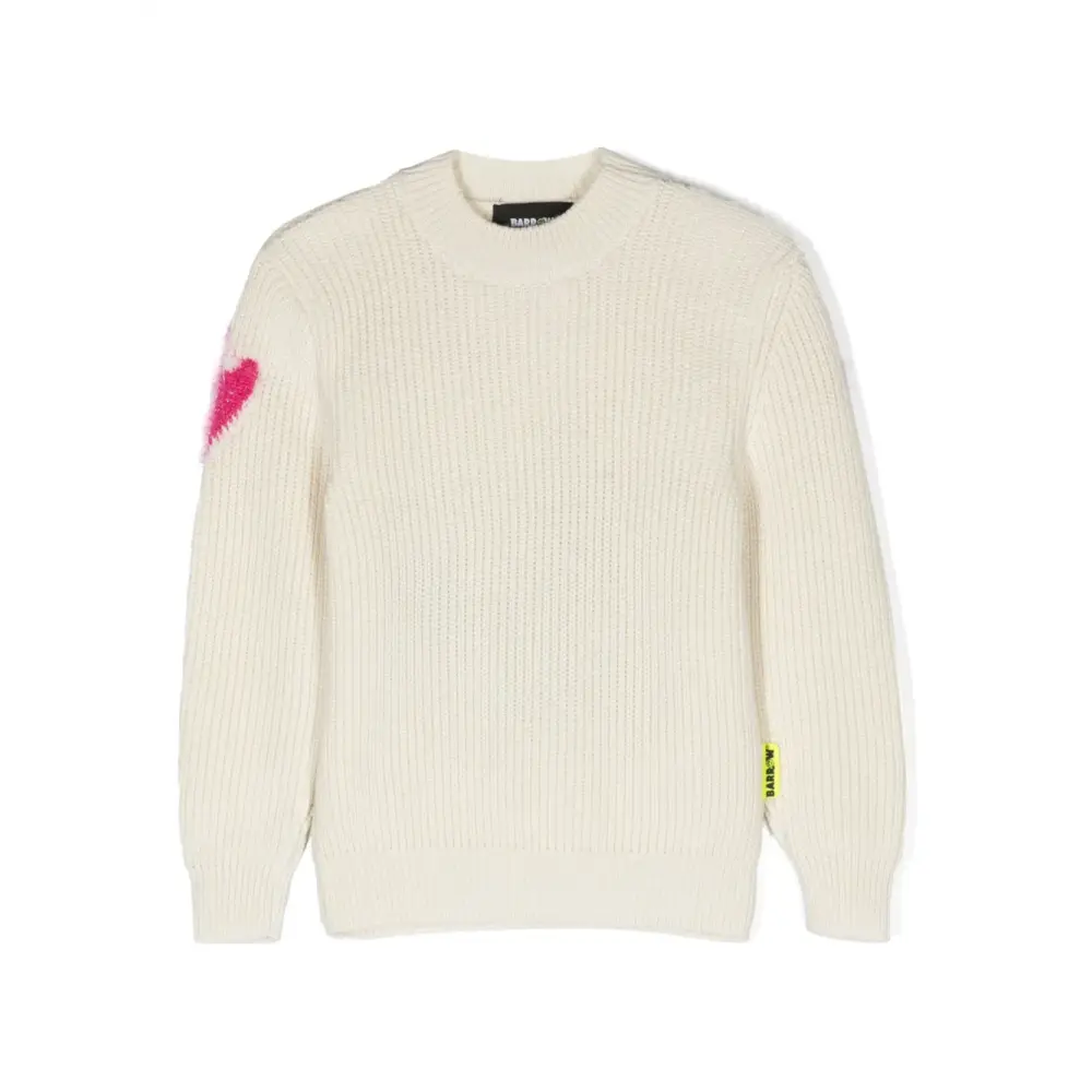 Экрю, разноцветный, трикотаж в рубчик, логотип в технике интарсия, воротник-стойка в рубчик и длинные рукава.
