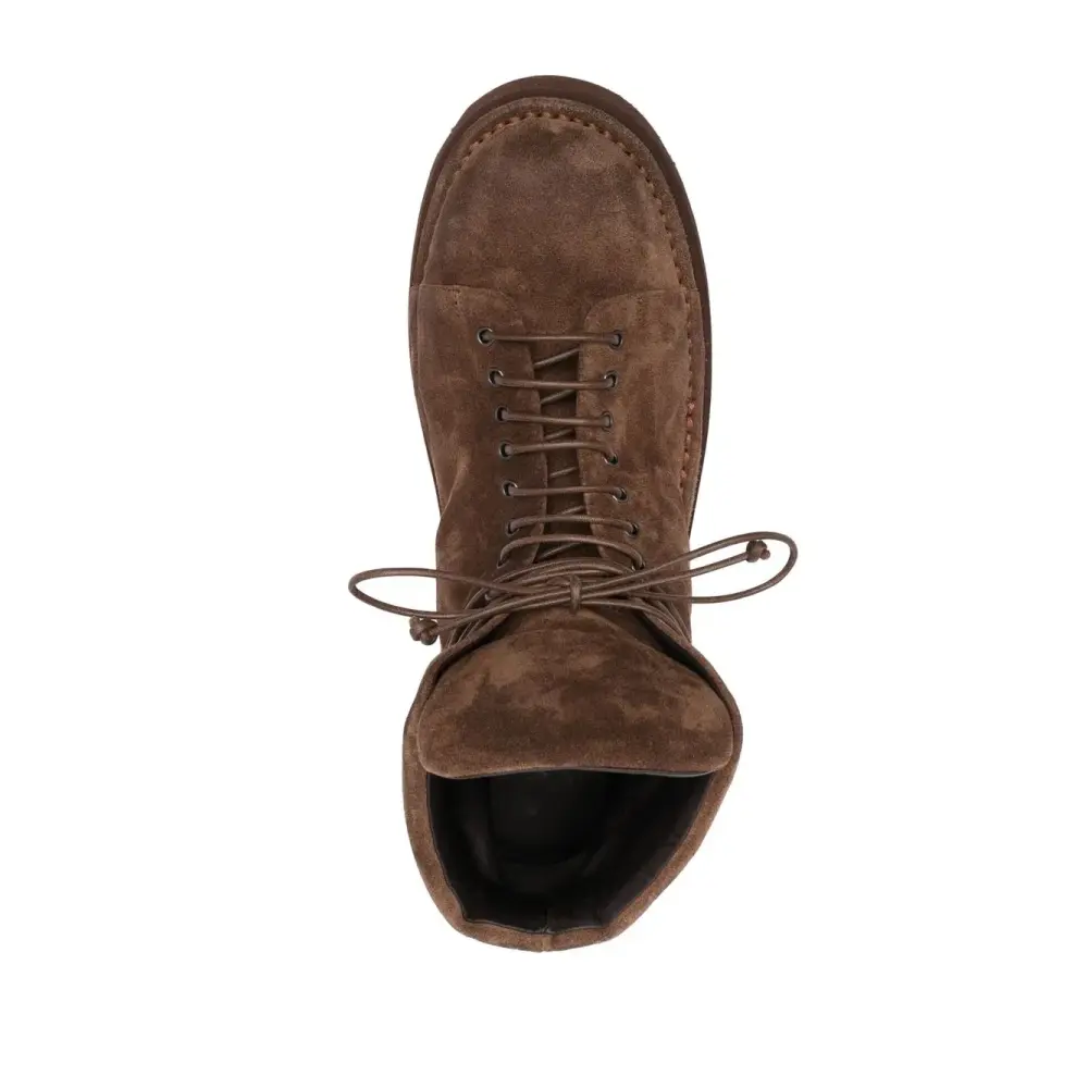 Шоколадный, замша из телячьей кожи, закругленный носок, шнуровка спереди и резиновая подошва.